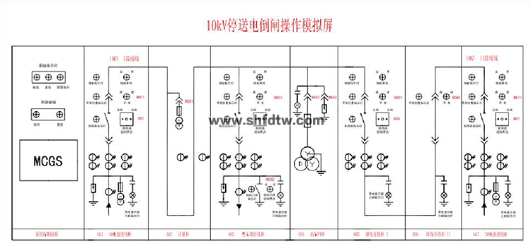 | 高压模拟屏 | 10kv停送电倒闸操作模拟屏主要用于教学配电房停送电倒闸操作模拟使用,其目的主要是为防止和降低电气人员误操作而带来危险,该系统可以顺利获得可编程控制器来编写不同模式的程序来实现不同模式下模拟功能,具有较高灵活性,从而来达到教学灵活性、多样性。使学员能够更容易的掌握高压倒闸步骤及操作方法。 整个系统有自由操作和考核两种模式。当未使用考核模式时(即不操作触摸屏),默认为自由操作模式,该模式无操作错误报警,可自由操作面板,适用于练习,亦可用于考核。若使用考核模式(使用前需先按操作面板复位按钮,然后进行触摸屏与面板的相应操作),该模式较为严格,操作流程错误触摸屏会跳出报警画面,面板各按钮指示灯熄灭,红色报警灯闪烁,无法进行下一步操作,直至按下复位按钮,系统回到初始状态,必要时可断电重启。 1.1 系统基本组成 10kv 停送电倒闸操作模拟屏采用三菱 FX3U-48MR PLC 作为控制单元,上位机使用昆仑通态(MCGS)触摸屏作为整个系统监视显示任务。整个系统的面板分别有系统控制面板、配电柜倒闸操作模拟控制面板组成。